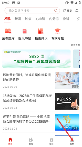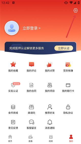 1、在醫(yī)療學(xué)術(shù)類應(yīng)用的首頁,點(diǎn)擊底部導(dǎo)航欄的“我的”選項(xiàng),進(jìn)入個(gè)人中心頁面,該頁面包含收藏、評論、醫(yī)師認(rèn)證等功能入口。