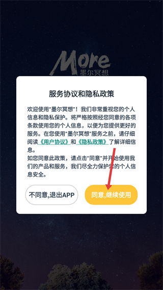 1、打開(kāi)“墨爾冥想”應(yīng)用后,在服務(wù)協(xié)議和隱私政策彈窗中,點(diǎn)擊“同意,繼續(xù)使用”按鈕,進(jìn)入應(yīng)用的推薦首頁(yè)。