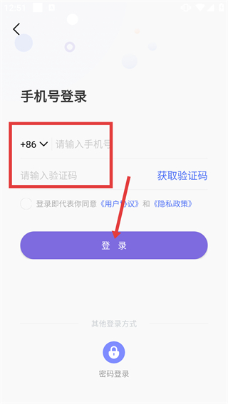 4、在手機(jī)號(hào)登錄頁(yè)面,輸入目標(biāo)手機(jī)號(hào),填寫收到的驗(yàn)證碼,點(diǎn)擊“登錄”按鈕,完成賬號(hào)登錄操作。