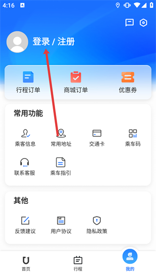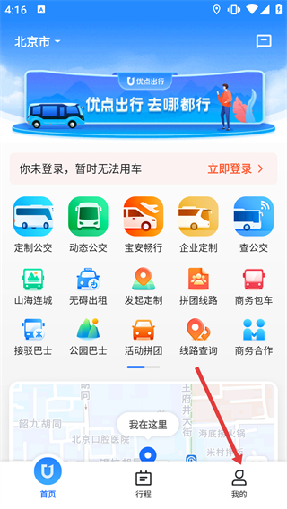 1、在優(yōu)點(diǎn)出行首頁(yè),點(diǎn)擊底部導(dǎo)航欄的“我的”選項(xiàng),進(jìn)入個(gè)人功能頁(yè)面,可查看行程訂單等相關(guān)功能入口。