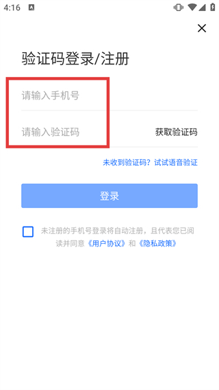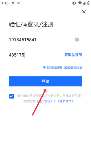 4、在驗(yàn)證碼登錄頁(yè)面填好手機(jī)號(hào)與驗(yàn)證碼,勾選協(xié)議后點(diǎn)擊“登錄”按鈕,完成賬號(hào)的登錄/注冊(cè)操作。