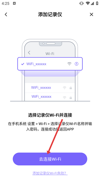4、進(jìn)入連接WiFi的步驟頁(yè)面,點(diǎn)擊“去連接WiFi”按鈕,按提示連接記錄儀對(duì)應(yīng)的WiFi網(wǎng)絡(luò)。