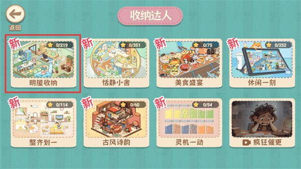 1、在【收納達人】主界面,點擊紅色框內(nèi)【明屋收納】關(guān)卡,進入該分類的子關(guān)卡列表。