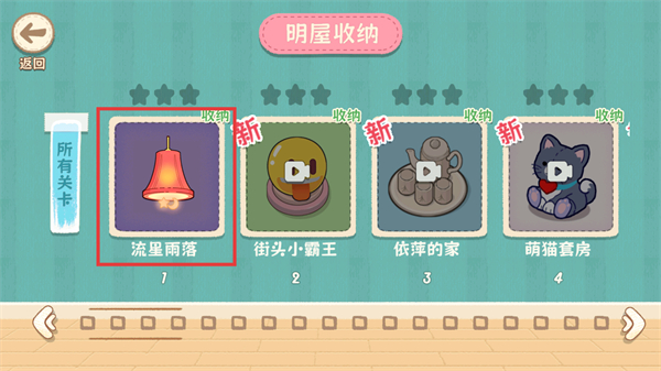 2、進入【明屋收納】子關(guān)卡頁,點擊紅色框內(nèi)【流星雨落-1】關(guān)卡,進入具體的收納操作場景。