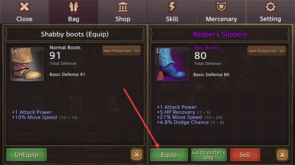 1、在【Bag】界面中,選擇屬性更優(yōu)的裝備,點擊【Equip】按鈕替換當(dāng)前裝備,提升防御等屬性。