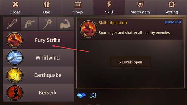 2、進(jìn)入【Skill】界面,查看技能的效果,待等級解鎖后學(xué)習(xí),增強(qiáng)戰(zhàn)斗中的群體輸出能力。